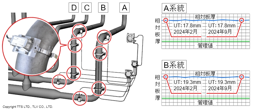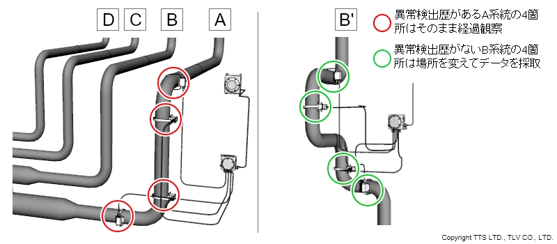 過去に減肉が確認されているA系統に4台残し、4台を今回新たに減肉が確認されたB系統の別の場所に移設してデータ収集をおこなうことにしました。