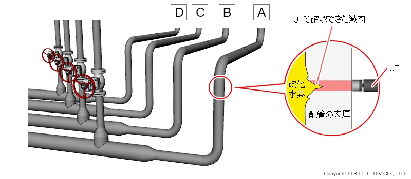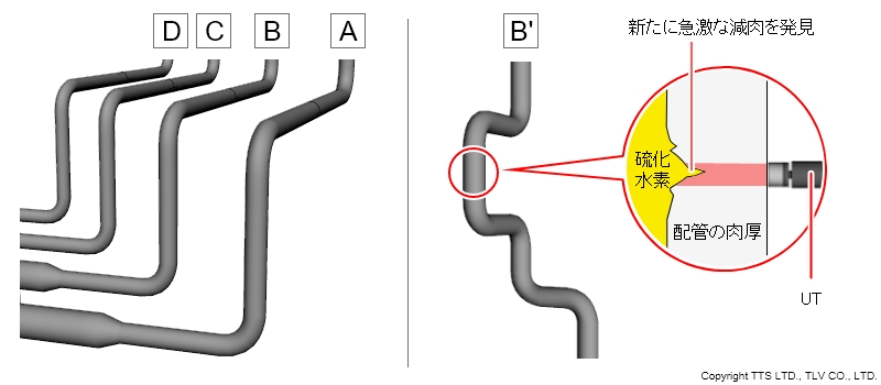 iPECの移設を実施する際に、iPECのデータを板厚換算するための基礎データ収集のため事前にUT検査を実施したところ、これまで減肉が観測されていなかったB系統で予想外に深刻な減肉が進行している個所が判明しました。